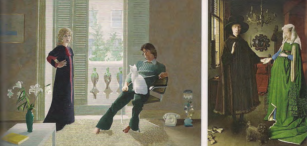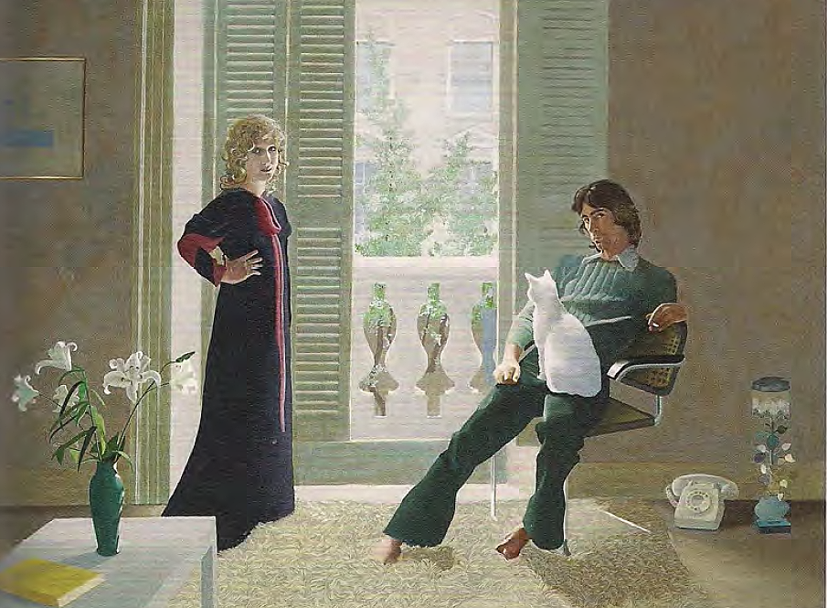 The couple in the painting are textile designer Celia Birtwell and fashion designer Ossie Clark, shortly after their wedding, at which the artist himself had been the best man. The piece is loosely based on the 15th century work, the Arnolfini portrait, by Jan van Eyck, but the positions of the male and female characters have been reversed. The suggestion is perhaps that it was Mrs. Clark who was the dominant partner in this particular relationship.