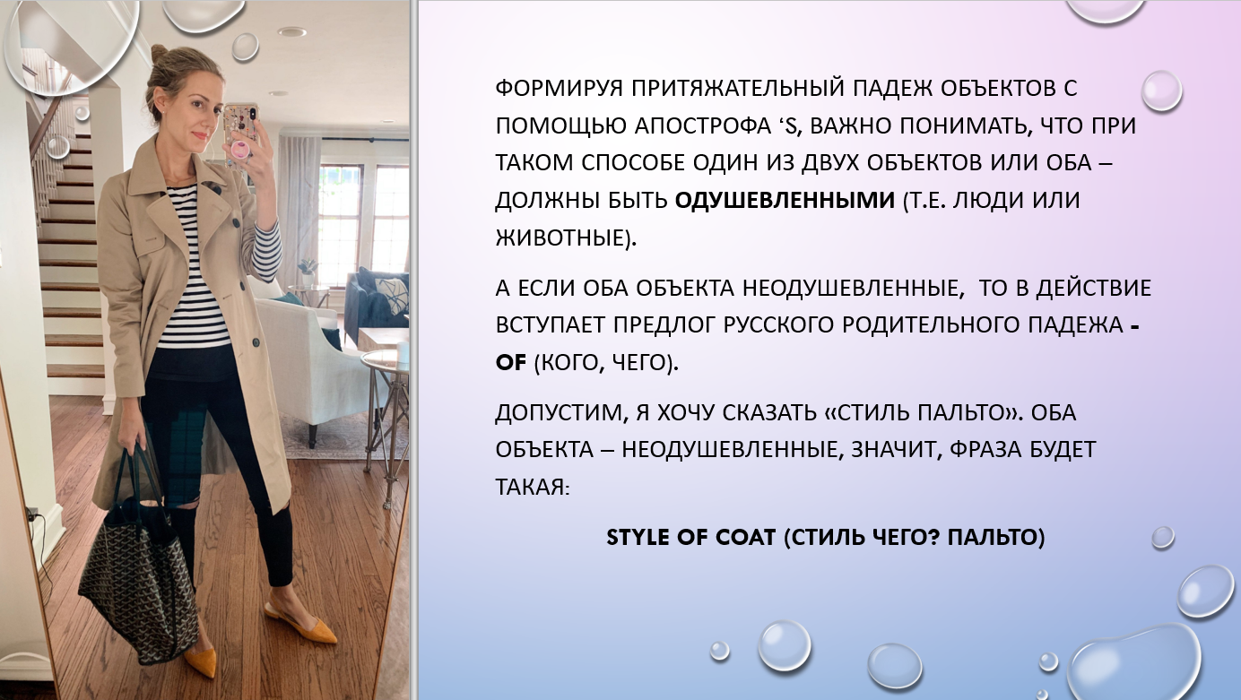Здесь чашка и кофе являются неодушевленными объектами, значит, связываем их с помощью предлога -of. А вот отец — это человек, значит принадлежащая ему чашка кофе и он сам соединяются с помощью апострофа.