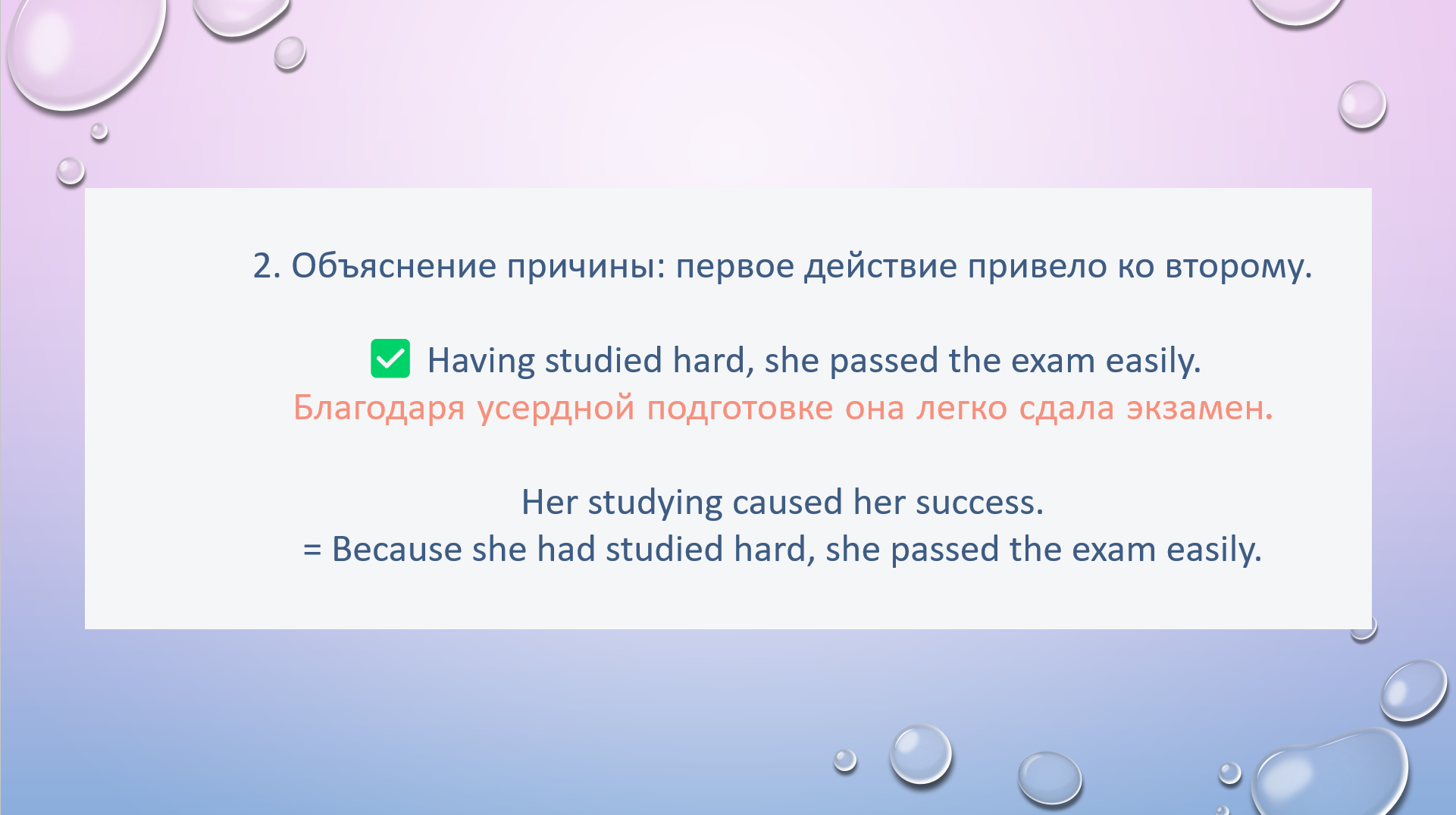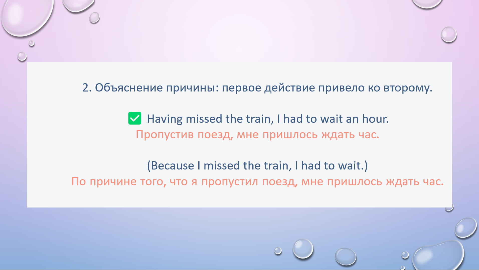 26.5 Read the sentence. Does the perfect participle show Sequence (one action before another) or Cause (first action explains second)?